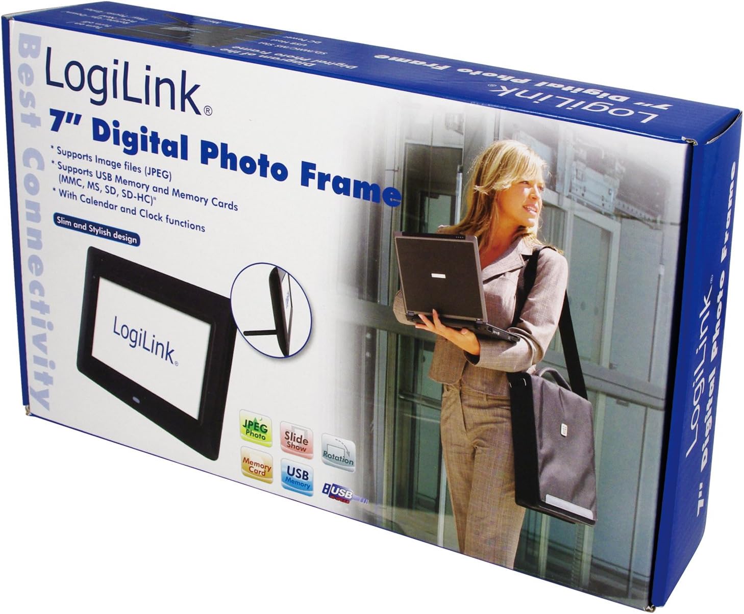 Image 1: The LogiLink PX0014 Digital Photo Frame packaging, showing the product box with a woman holding a laptop and an inset image of the frame itself.