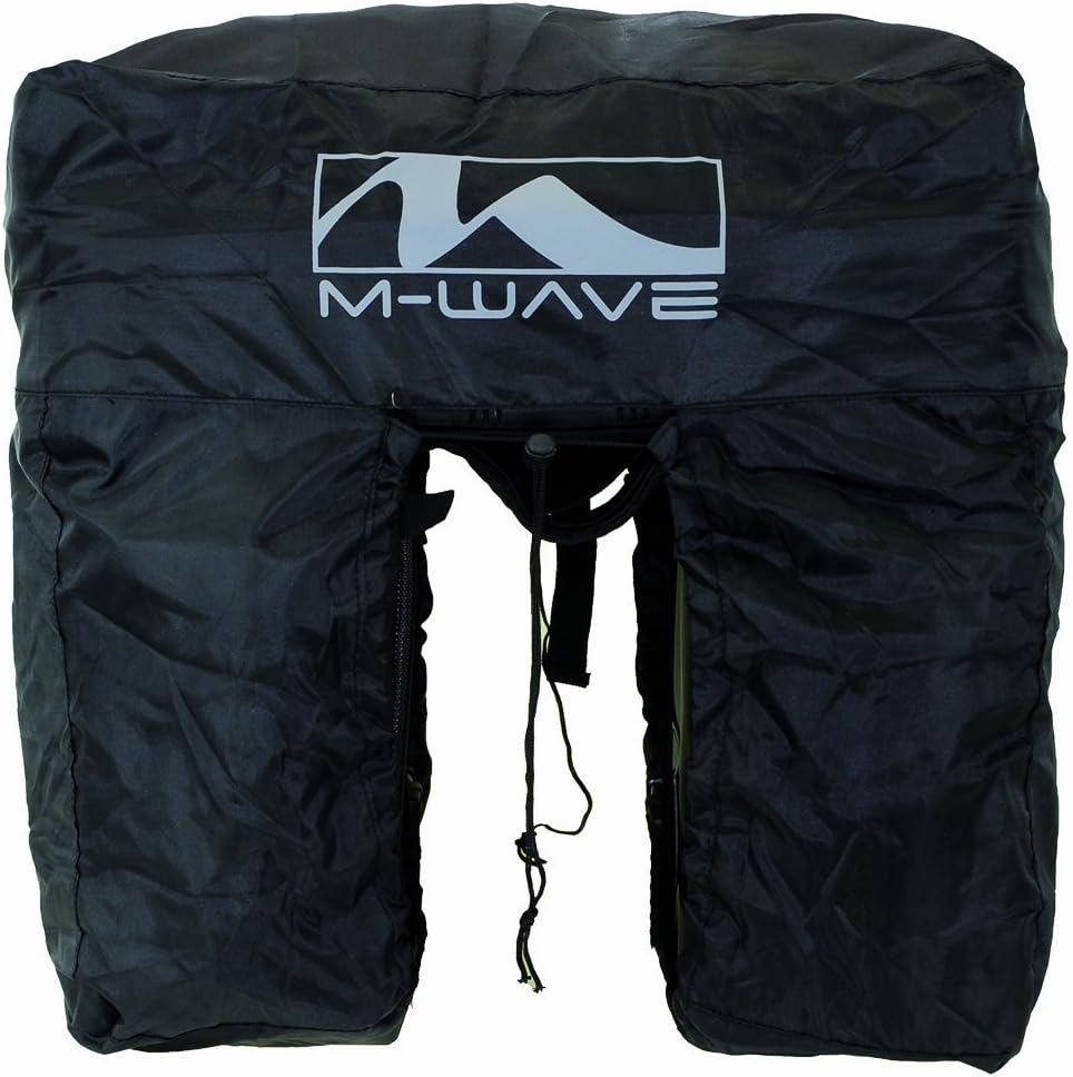 රූපය 1: The M-Wave Pannier Rain Cover, shown in black, designed to fit over bicycle panniers. It features a central opening for the bike rack and a drawstring closure at the bottom.