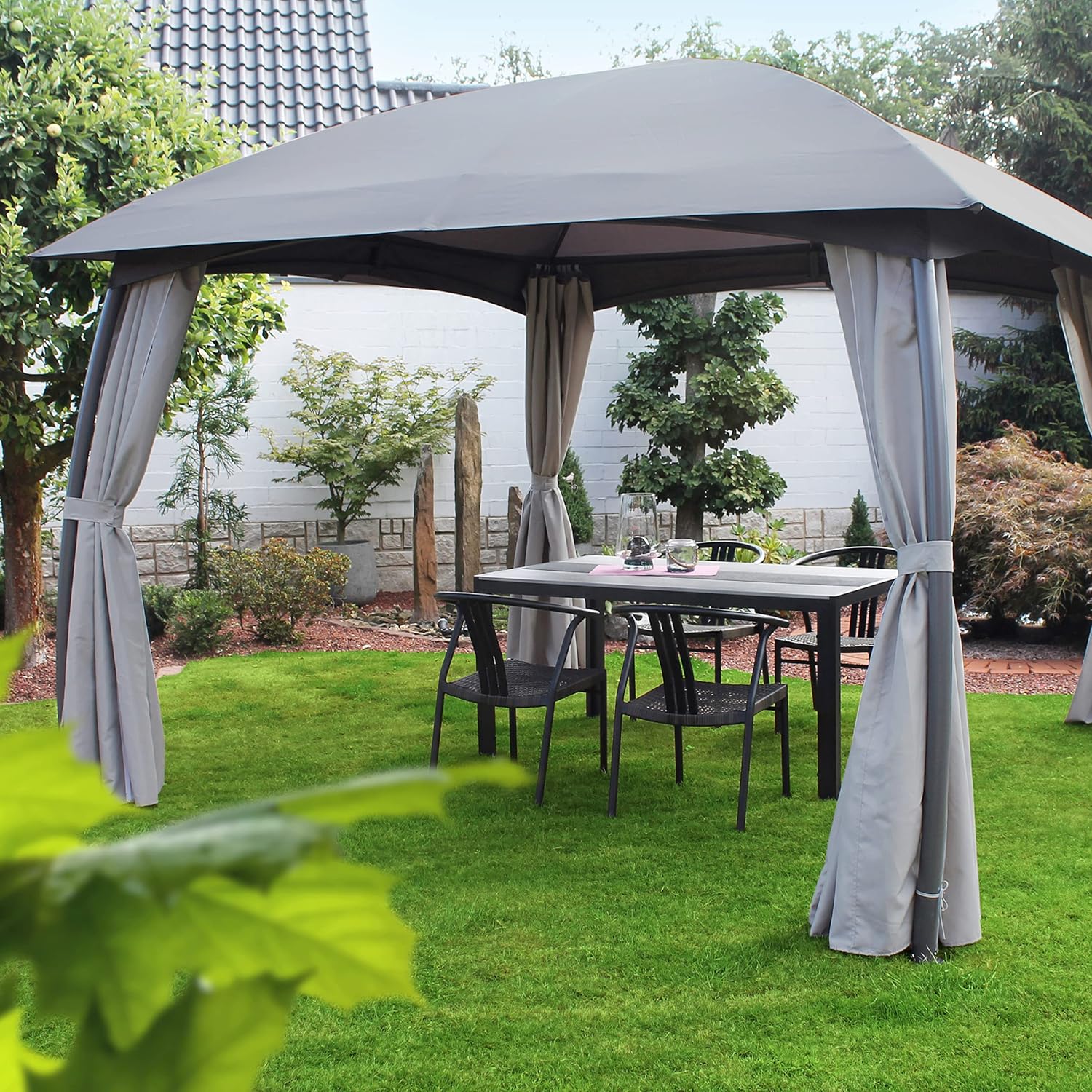 The LECO Tonnelle Milena gazebo is designed for straightforward use, offering flexibility for various outdoor conditions.