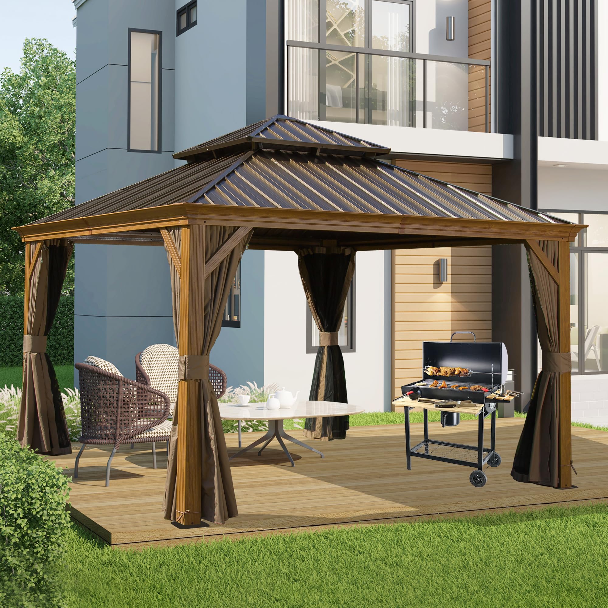 - The gazebo features a double-track system with double-sided zippers for easy sliding of both the bug netting and privacy curtains.