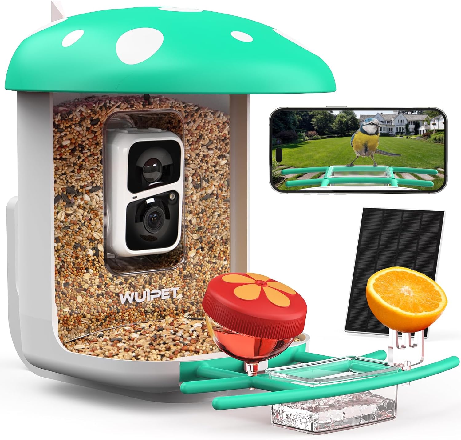 Image: The WUIPET Smart Bird Feeder with its integrated camera, solar panel, and various feeding accessories.