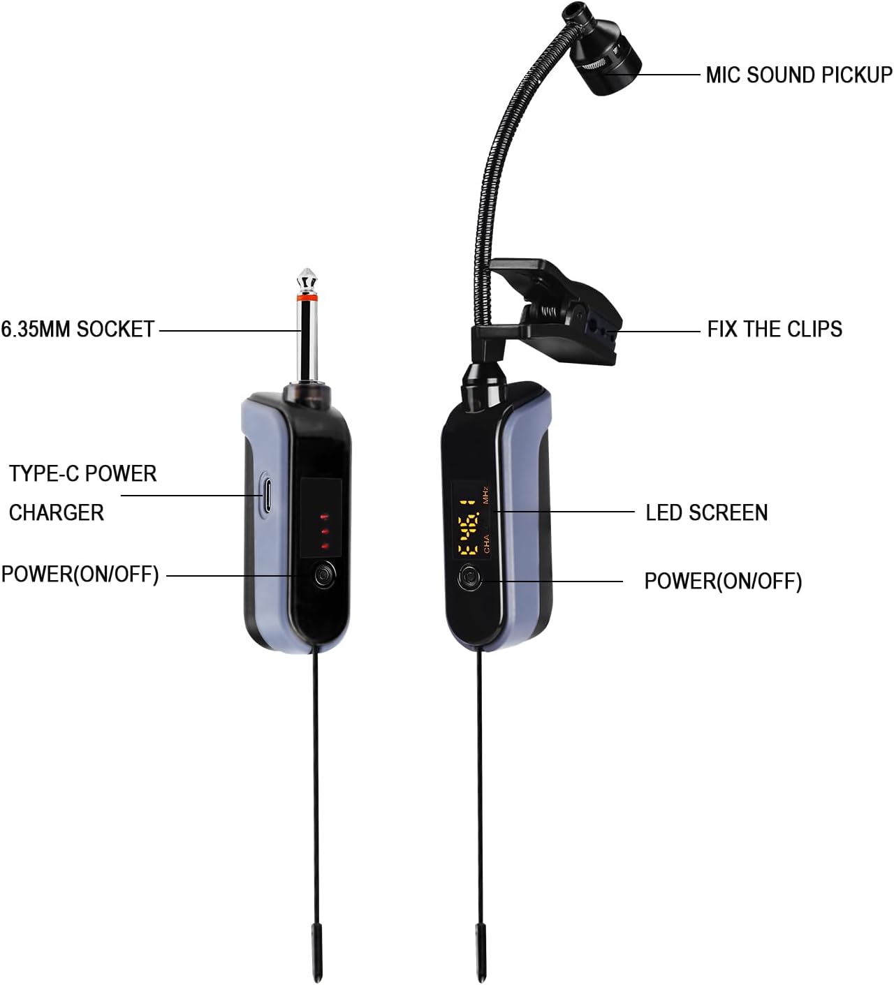 - ගැළපුම: This wireless microphone is compatible with voice amplifiers, speaker systems, and audio mixers. It is suitable for various brass instruments such as trumpets, horns, trombones, and other wind instruments.